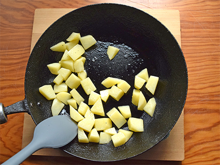 熱したフライパンに油を大さじ1引き、じゃがいもを中火でじっくり炒める。