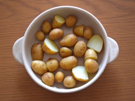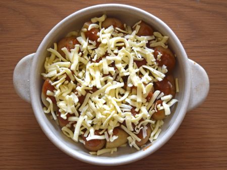 ゆであがった豆じゃがは耐熱皿に並べる。